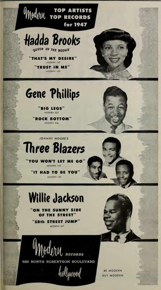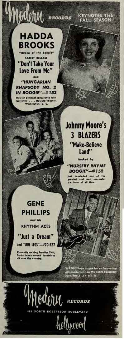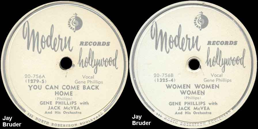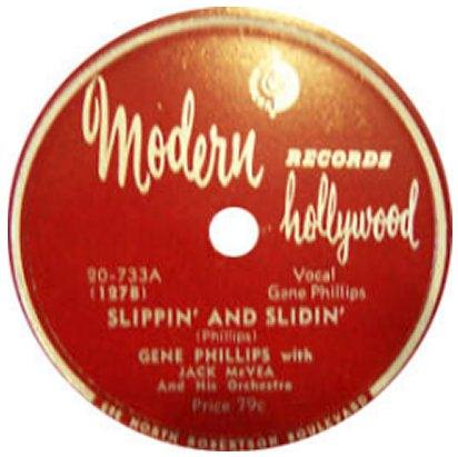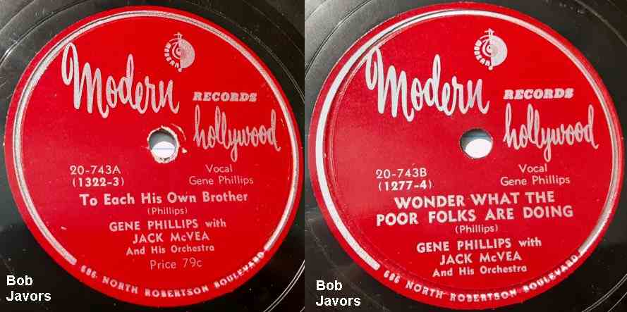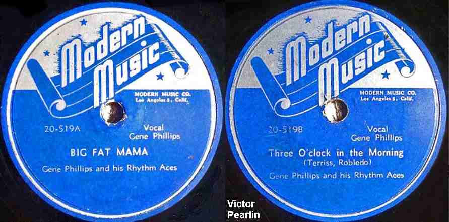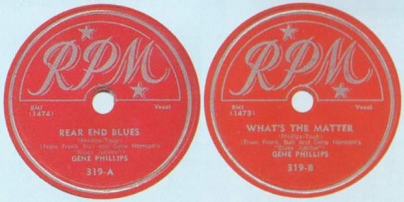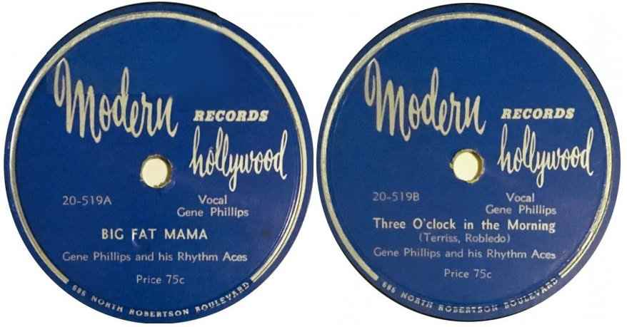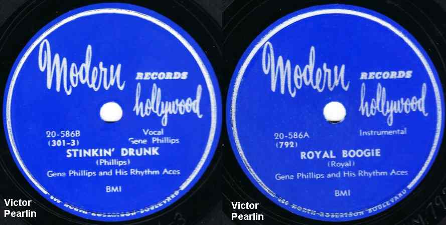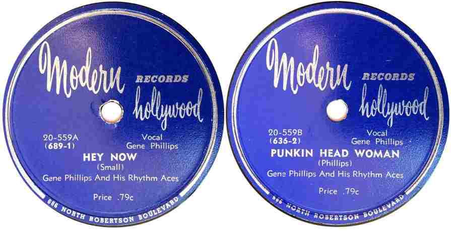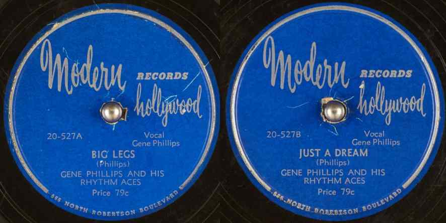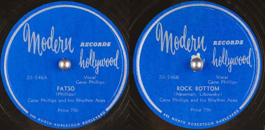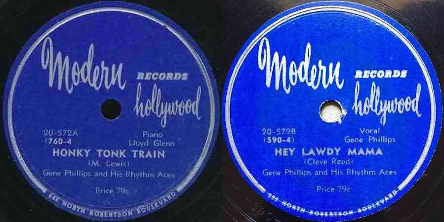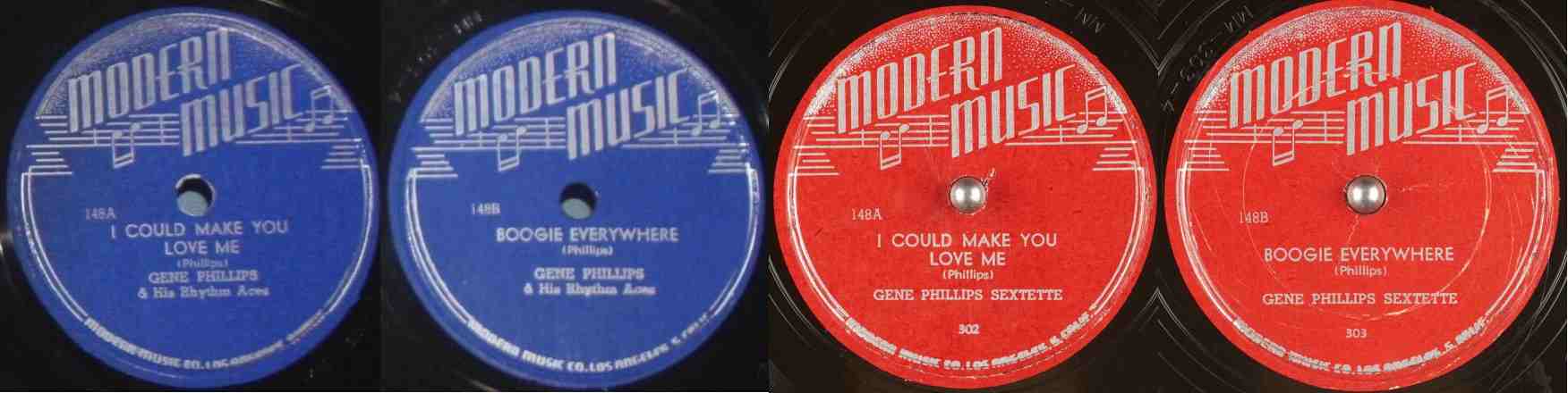 Supposedly Jake Porter brought Gene to the attention of Modern Records, where, on September 16, 1946, Gene had his first session as bandleader (and would also do the vocals on all Modern sides that weren't instrumentals). The group on this session (probably put together by Porter) consisted of: Gene Phillips (guitar and vocals), Jake Porter (trumpet), Marshall Royal (alto sax), Maxwell Davis (tenor sax), Lloyd Glenn (piano), Art Edwards (bass), and William Street (drums). Except for Edwards, I doubt that any of them were in the Rhythm Aces that Gene appeared with (although the recordings were credited to "Gene Phillips & His Rhythm Aces"). The tunes (all of which have Gene's vocals, except the instrumental "304 Boogie") were:
