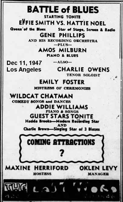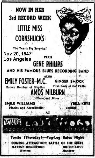 Said Vernon 'Jake' Porter (thanks to Bernard Mascle): "Well, I think the first time I saw Gene Phillips, he was working with Lorenzo Flennoy’s Trio. We were doing a show down in Los Angeles and they were one of the acts. I guess it was about 1942 or the latter part of '43. I was playing at a big show house downtown, right off Broadway - I think The Belasco was name of the theater."