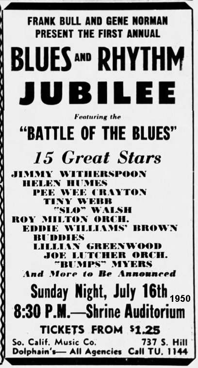 His band was usually known as the "Rhythm Aces". It included Jake Porter (trumpet), Al "Cake" Wichard (drums), Maxwell Davis (tenor sax), Marshall Royal (alto sax), Jack McVea (sax), Bumps Meyers (sax), and Lloyd Glenn (piano). NOTE: "included" doesn't mean they were all on one session. There were probably many, many others. As I've said in the past, members of a band come and go at an astonishing rate, so when I name members, consider that a snapshot at a given moment. Actually, only in May 1945 were the members of the performing Rhythm Aces ever named; members credited on labels were probably mostly studio musicians brought together for the session.