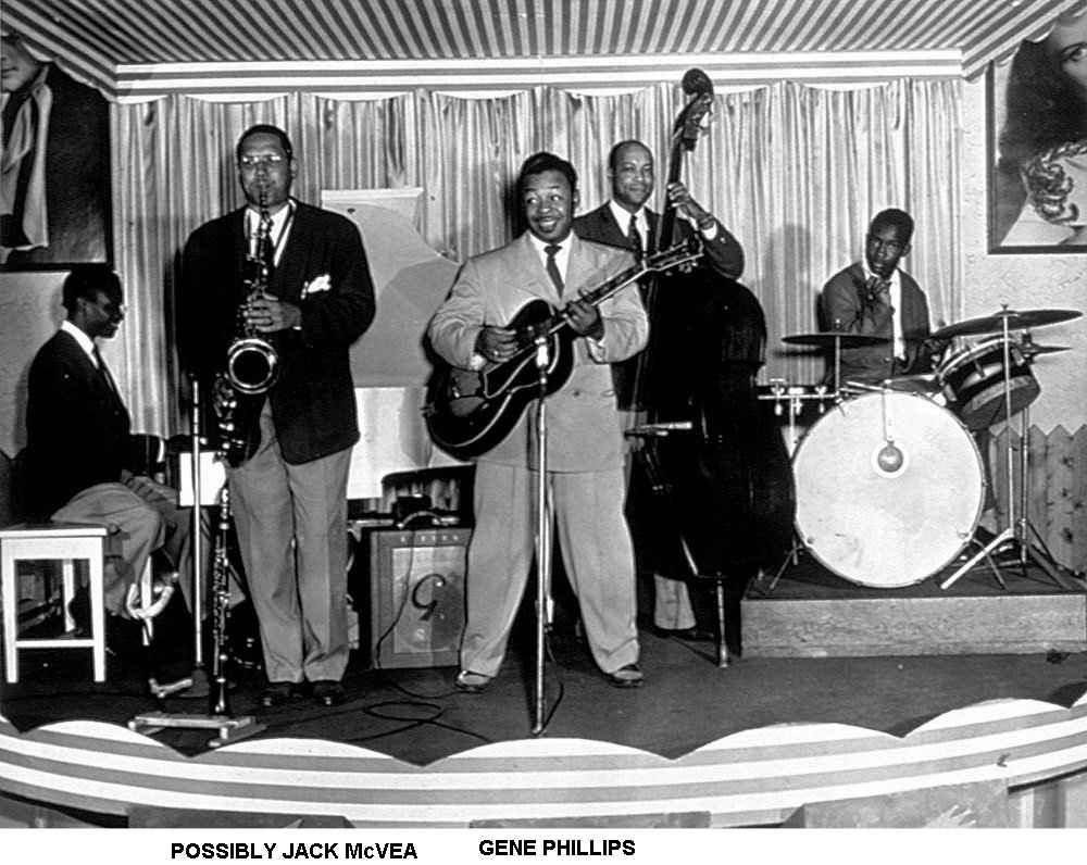 In September 1945, Gene was the guitarist in a series of Los Angeles recording sessions for Apollo Records. The first of these (probably done over two or three days, based on the number of recordings) was with Jack McVea's band. (In the following year, McVea would become famous with his version of "Open The Door, Richard!") The musicians were (according to the label on "O-Kay For Baby"): Jack McVea (sax), Bob Mosley (piano), Frank Clarke (bass), Robert "Rabon" Tarrant (drums), Gene Phillips (guitar), and John Buckner (trumpet). The songs were (you'll find the release information in the discography):