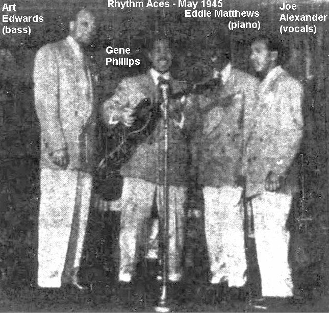 Gene Phillips is the organizer of the group. Gene is well known in the entertainment world, having been with the famous Mills Brothers. In fact, Gene came to Los Angeles with them, playing a long engagement at the Florentine Gardens. He was their guitarist and, falling in love with this climate, decided to make L. A. his home. Since remaining here, Gene has played with the Flennoy Trio, who furnished music for many clubs, including the Last Word, the Casa Blanca, the Swanee Club, the Orpheum Theatre, and many other first class places. He has named his outfit the RHYTHM ACES. He is also the writer of that well-known song hit, "She's My Honey Chile" [which the Flennoy Trio had recorded as "My Honey Chile"].