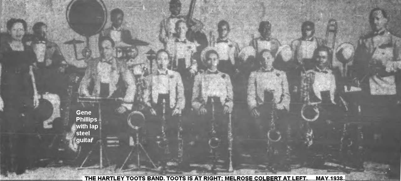 In 1938, he somehow became guitarist with the highly-successful territory band of Hartley Toots in Miami. At the time, Toots' singer was Melrose Colbert. A photo of the band shows Gene playing a horizontal guitar (the only time he seems to have been photographed playing that way). He was probably with Toots when the band played the Apollo Theater in July 1938.