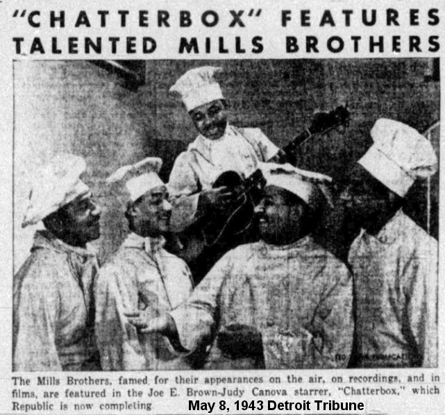 Gene also appeared in three films with the Mills brothers: Reveille With Beverly (Columbia Pictures; released February, 1943), He's My Guy (Universal Pictures; released March, 1943), and Chatterbox (Republic Pictures; released April, 1943). Presumably all their sequences were filmed in late 1942. Just to show you how up-to-date newspapers were, the accompanying photo from the May 8, 1943 Detroit Tribune says that Chatterbox "is now completing"; however, it was already being shown in theaters by April 4.