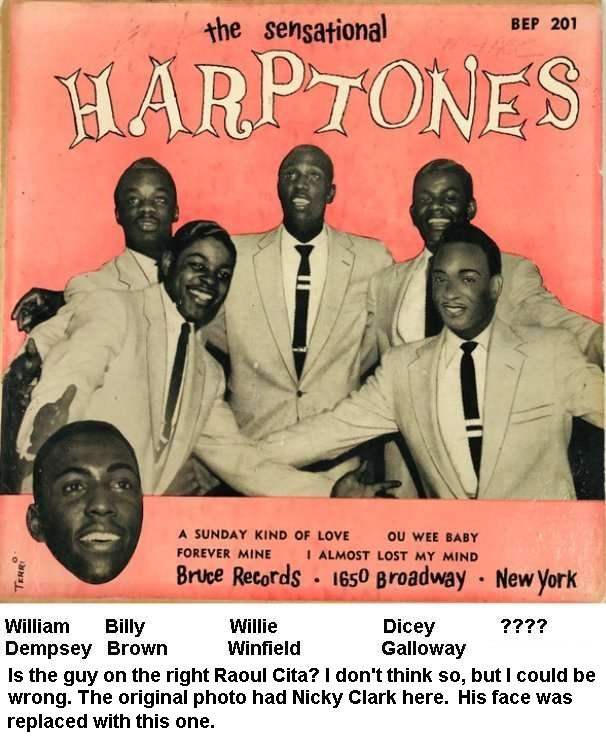 But who were the Harptones at this point? Both Nicky Clark and Billy Brown had departed, and Cita had picked up Bobby Spencer (who had sung, or would sing, formally or informally, with half the New York groups around at the time). So for that session, the group was Willie Winfield, Raoul Cita, William Dempsey, Jimmy Beckum, and Bobby Spencer. This was the only session Bobby Spencer was on; Billy Brown returned soon after.