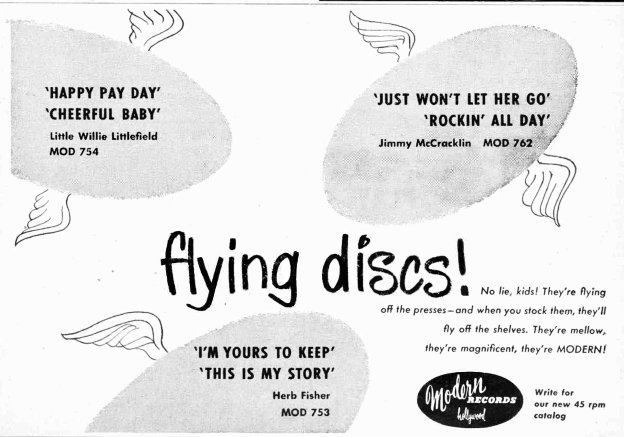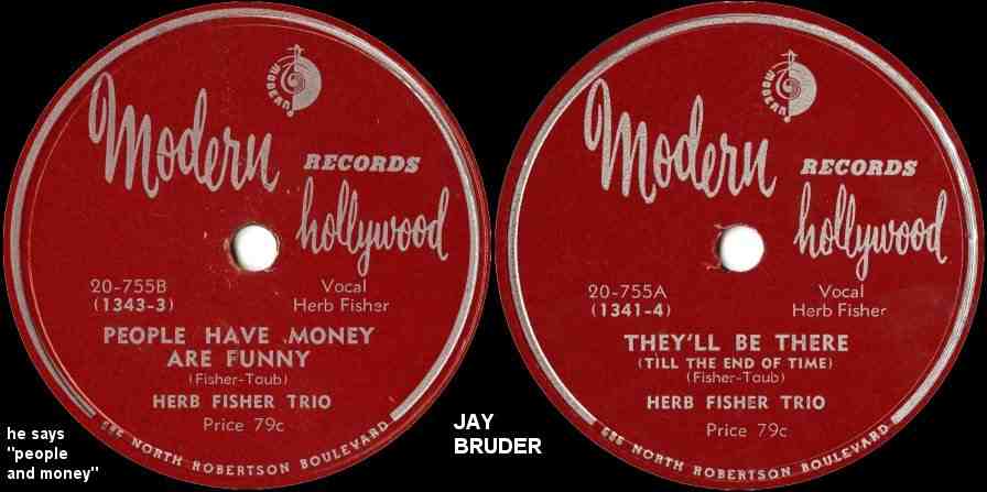 Also in September, Modern issued "People And Money Are Funny" (mistitling it "People Have Money Are Funny"), coupled with "They'll Be There (Till The End Of Time)". This time, credit went to the "Herb Fisher Trio", but this is the last time credit was anything except plain "Herb Fisher". They were reviewed in the September 9 Cash Box and the October 21 Billboard: