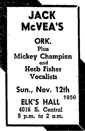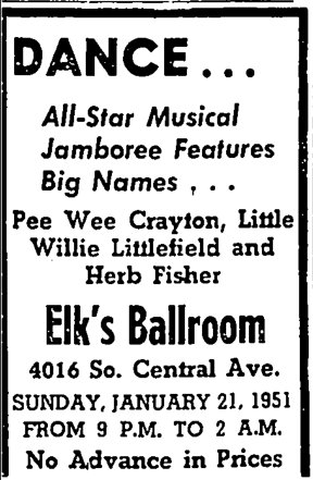 Finally, Herb appears somewhere! On September 30, 1950, he was one of the acts at the Elk's Ballroom on South Central Avenue. Also there were the Johnny Crawford Orchestra and Percy Mayfield.
