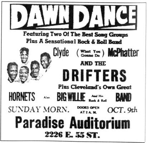 On August 6, 1954, the Drifters played the Cleveland Public Auditorium as part of a Gale Agency tour. (It was trumpeted in a Cleveland Call And Post article on July 24 as a "Rythm and Blies Show".) MC'd by Alan Freed, the show also had Roy Hamilton, Faye Adams, Big Maybelle, Lavern Baker, the Counts, the Spaniels, Erskine Hawkins' Orchestra, and Rusty Bryant's Orchestra. At the time the Drifters were: Little David Baughan (lead), Gerhart Thrasher (tenor), Andrew Thrasher (baritone), Bill Pinkney (bass), and Jimmy Oliver (guitar). (Original lead Clyde McPhatter had been drafted, and David Baughan, whose voice was quite similar to Clyde's, was picked by the others to replace him.) Johnny Moore approached Bill Pinkney backstage and inquired about any likely future openings with the Drifters. Nothing came of it then. But it would.