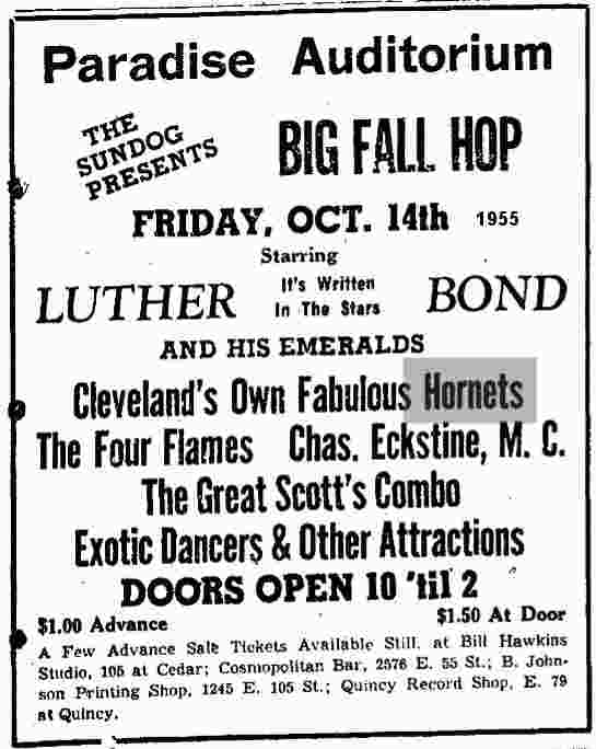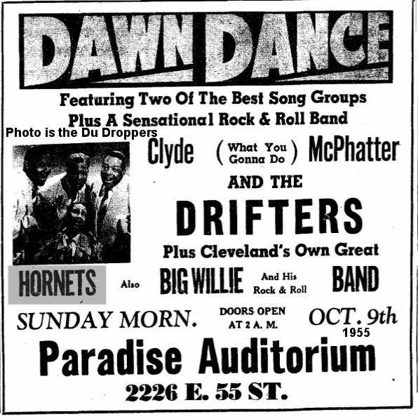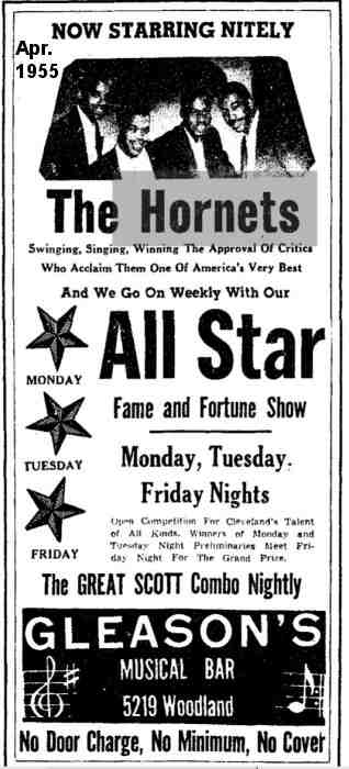 Galen Gart's Rhythm & Blues In Cleveland – 1955 Edition details many appearances by the Hornets during 1955. They were the headline singers at Gleason's Musical Bar from the last week of 1954 through January 21, 1955 (along with Milt Buckner's band). They headlined at Gleason's again (with the Ernie "The Great" Scott's Orchestra) in March and April. In May, it was reported that William "Jap" Gleason (owner of Gleason's) was now managing them and there was a tour planned with Sarah Vaughan. On July 17, they sang at a dawn dance held at Cleveland's Paradise Auditorium with Big Maybelle, Cool Papa Jarvis, and Great Scott. There was a reunion of sorts on October 9, when both the Hornets and the Drifters (now with Johnny firmly in the lead) appeared, for another dawn dance, at the Paradise, along with Big Willie and his Rock & Roll Band. (What makes no sense about this performance is that the advertisement mentions "Clyde McPhatter and the Drifters", plus "Cleveland's Own Great Hornets". I would think that if "Cleveland's Own" was so important to advertise, they would have realized that Clyde McPhatter was no longer with the Drifters and that one of "Cleveland's Own" was now the lead singer. So much for local pride! To add insult to injury, the photo of the Drifters published in one Paradise ad was actually of the Du Droppers!) The last mention I can find of them is on October 14, when they were once again at the Paradise, for the Big Fall Hop, this time with the 4 Flames (a local group), Luther Bond & the Emeralds, and the Great Scott Orchestra.