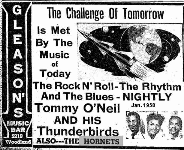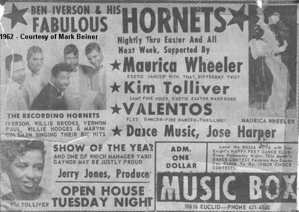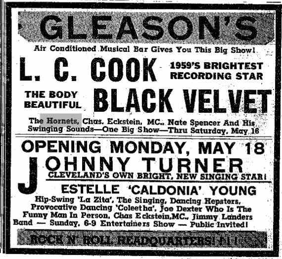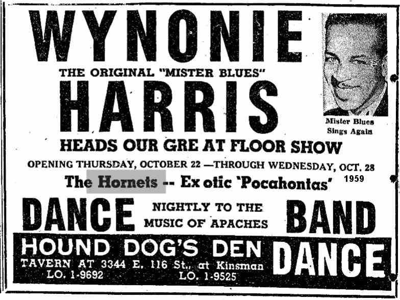 The last appearance I could find in the 1950s was at Hound Dog's Den from October 22-28, 1959, along with Wynonie Harris. The Hound Dog's Den was owned by Sam "Crazy Man, Crazy" Sampson, a DJ on WJW, who'd once been named the "new Prince Of The Moondoggers" after Alan Freed left town.
