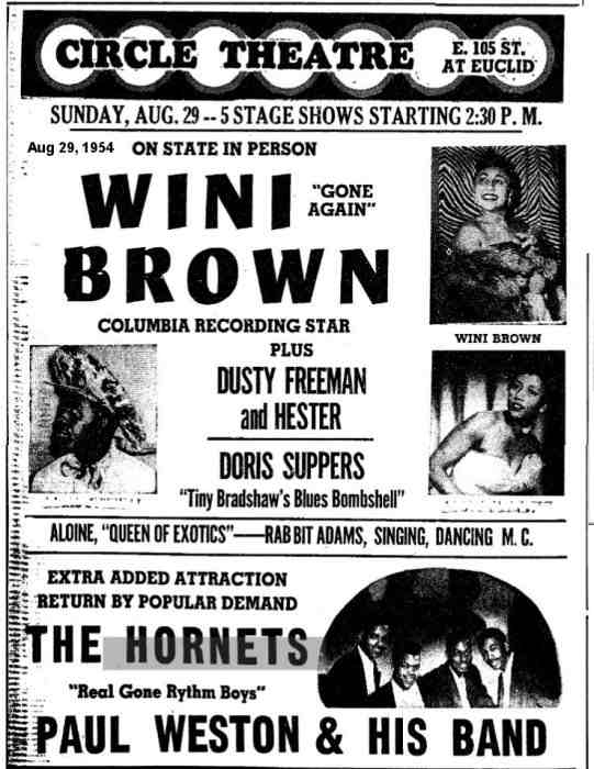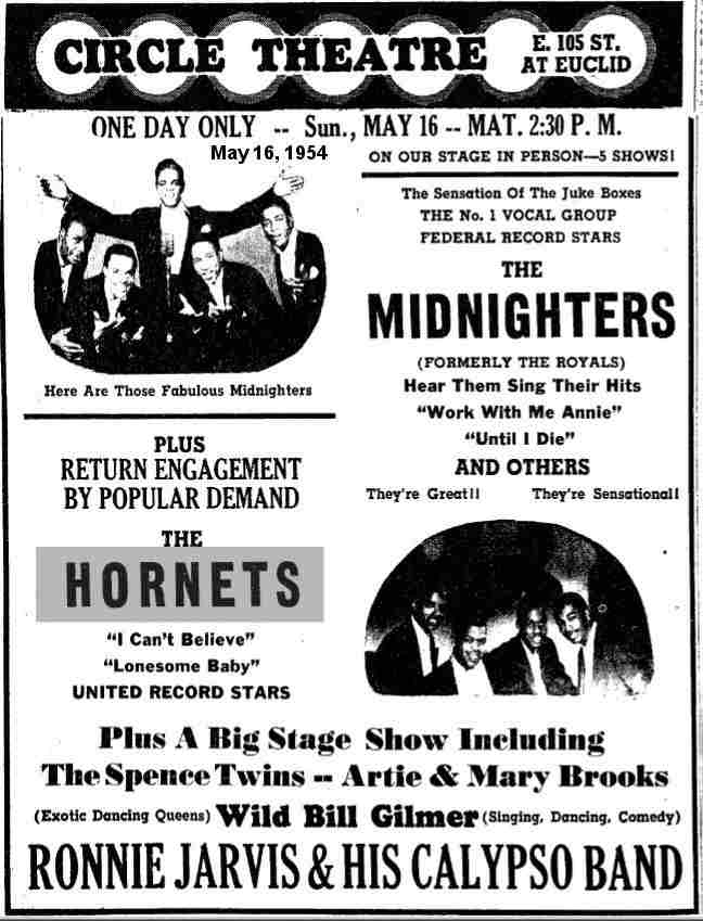 On May 16, 1954, the Hornets were back at the Circle Theater, this time in the company of the Midnighters ("Formerly The Royals"). This was, said the ad, a "Return engagement by popular demand".