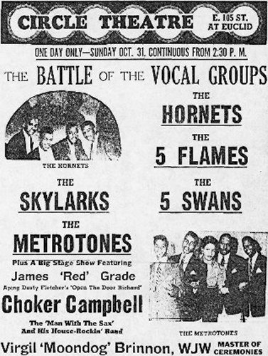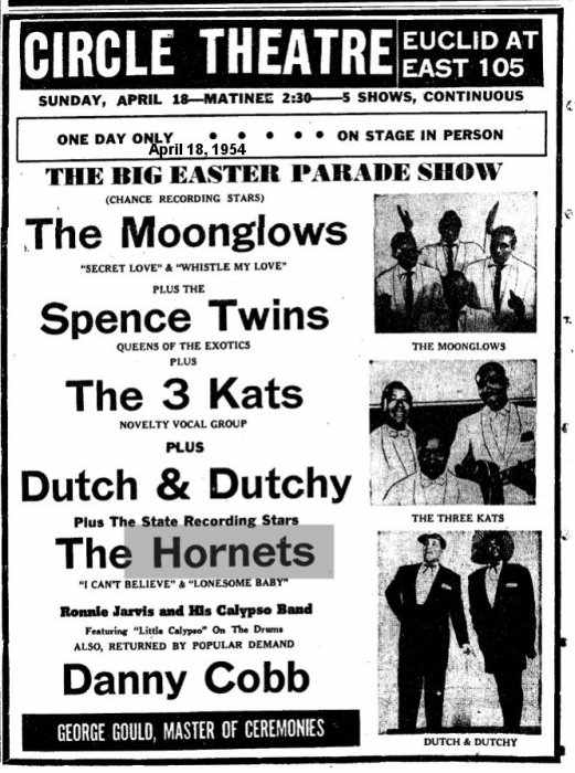 On April 18, 1954, the Hornets appeared as part of the Easter show at the local Circle Theater. Others on the bill were the Spence Twins ("Cleveland's own dancing darlings"), the Moonglows, the 3 Kats, Danny Cobb, and Ronnie Jarvis & His Calypso Band. A little blurb in the April 17 Cleveland Call And Post said: "Also featured in the revue is another singing group, The Hornets, who feature Blind Tommy Malone, Clevelander, at the piano. The Hornets are listed among the State Recording Company's stars, with 'I Can't Believe' and 'Lonesome Baby' already released and selling well." In spite of the wording, Blind Tommy Malone, who appeared all over Cleveland, was just used for backup; he wasn't a member of the group.