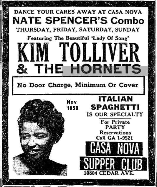 In October 1958, they were at the Cedar Gardens in Cleveland. The photo with the ad shows five members, but it's not clear enough to figure out who's who. The next month, they were at the Casa Nova along with Kim Tolliver, who'd been in the Metrotones before Leuvenia Eaton. In early May 1959, they appeared at Gleason's with L.C. Cooke (brother of Sam Cooke), whose name was misspelled in the ad.