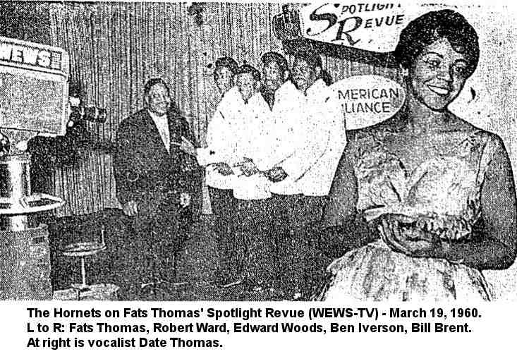 On March 19, 1960, they were guests on Fats Thomas' Spotlight Revue TV show on WEWS. There was a photo of the group with identification: Robert Ward, Edward Woods, Ben Iverson, and Bill Brent. This is the same line-up that I mentioned a few paragraphs ago, except that bass Bill Brent had returned to replace Sidney Elbee.