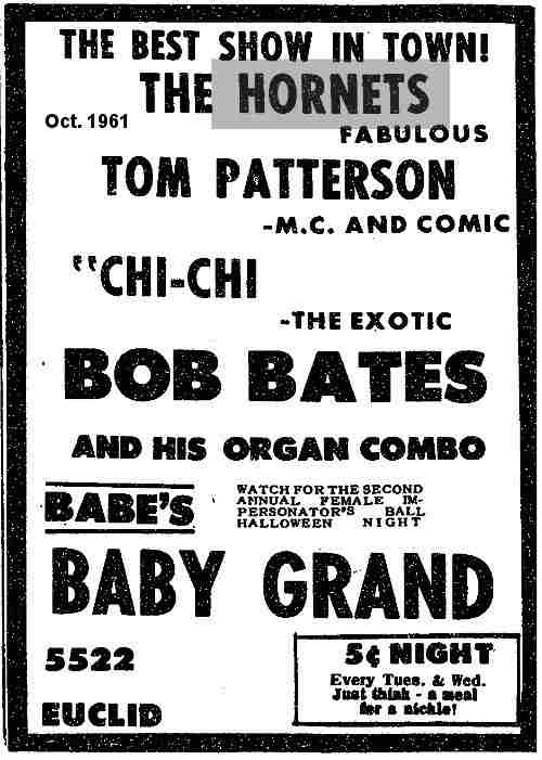 In late February 1961, the Hornets were at the Blackstone Cafe along with the 5 Quails. October of that year found them at Babe's Baby Grand.