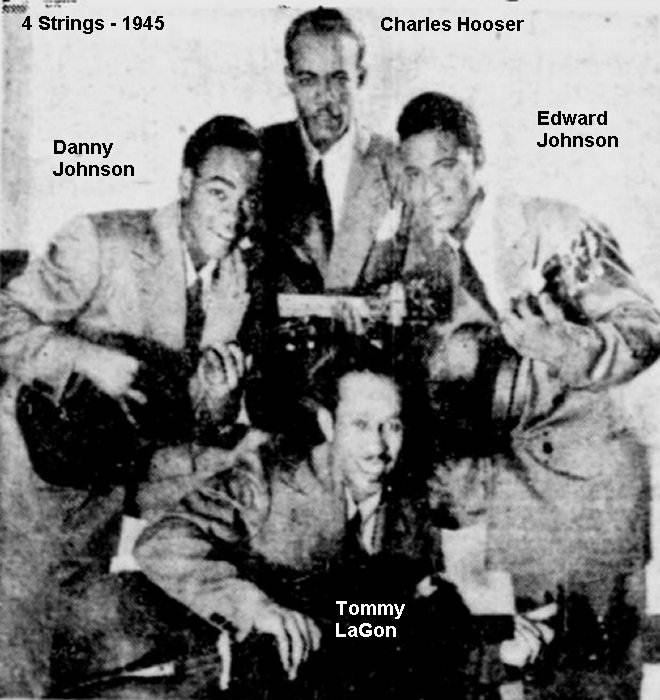 So, in that 1947 paragraph above, I named five members; this blurb names four of them, all but Thomas Harrod. Therefore, the group's origin is as the 4 Strings, somewhere near the beginning of 1945. And, they were "discovered by J.C. Bailey"; if the "J." is for "James", then we've got the answer to where the eventual name came from. (However, as it turns out, his name was Junius. Hey, I tried.) As a bonus, the article came with a photo of the 4 Strings, with the members identified. The same photo was repeated in the October 6 Washington Afro-American, which told us that they'd recently been at the Neophite Club in Richmond, Virginia.