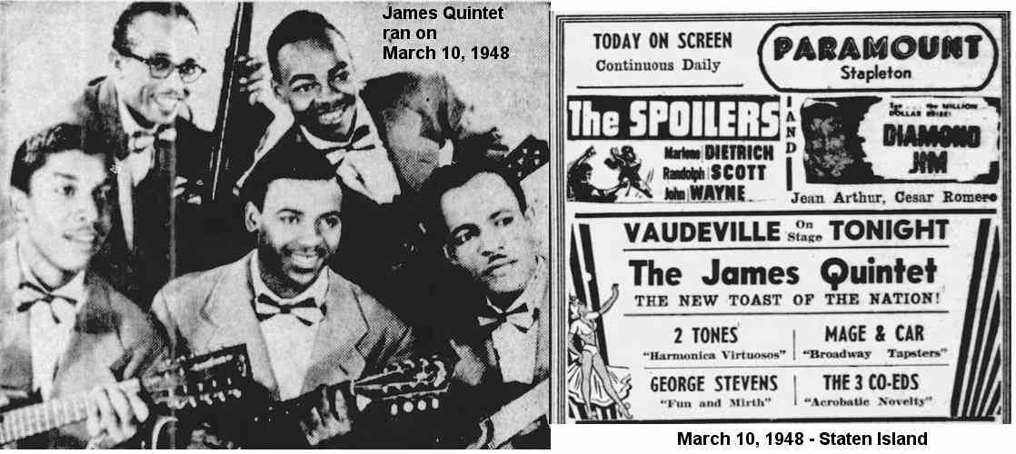 In late November 1948, the James Quintet appeared at Jerry Marsh's Show Lounge in Utica, New York. "If you like music in the Ink Spots manner, you'll go for the music that these boys play" went the ad.