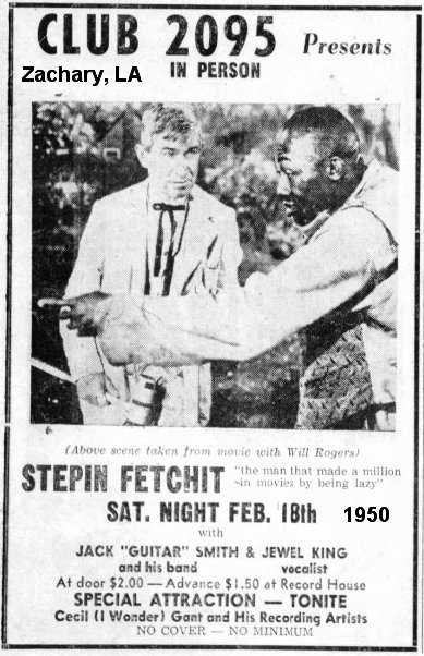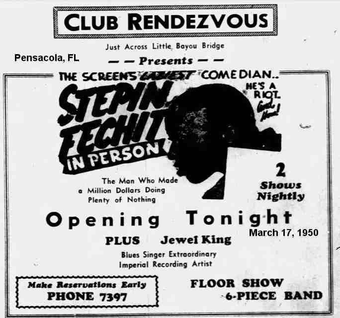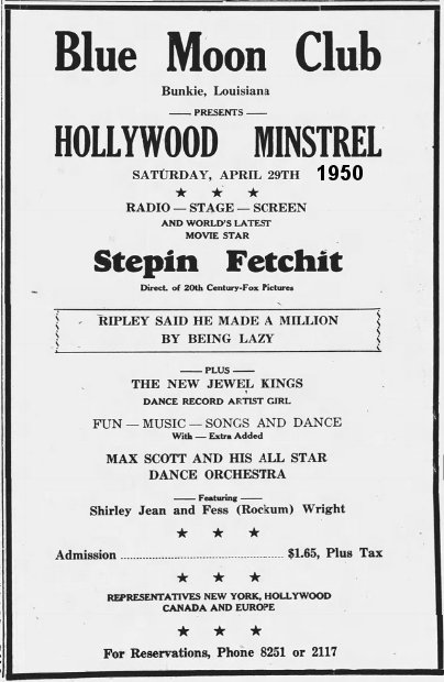 Instead, she and Scott toured with movie star Stepin Fetchit from February to April 1950. This was announced in early February and became another "not much of a tour": I could only find four ads - three in Louisiana and one in Florida. One didn't have her name, one corrupted it ("The New Jewel Kings - Dance Record Artist Girl"), one had the band of "Jack 'Guitar' Smith [sic]", and another had "Max Scott And His All Star Dance Orchestra".