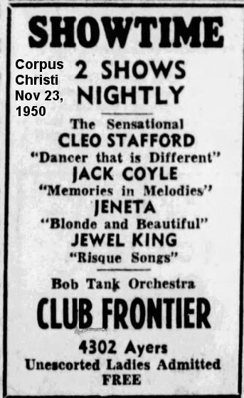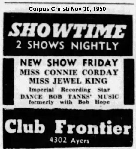 In late November 1950, Jewel appeared at the Club Frontier, in Corpus Christi. Not mentioned in the ads was Jack Scott's band. This is the last appearance I can find for her until 1956.