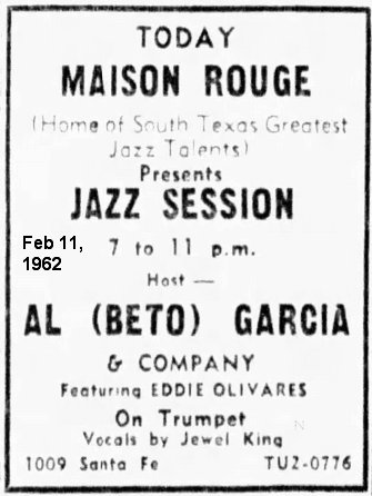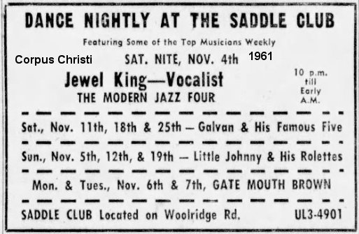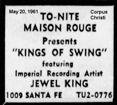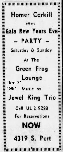 For New Years Eve 1961, the Jewel King Trio (whoever they might have been) was at the Green Frog Lounge in Corpus Christi. It was the only time they were ever advertised.