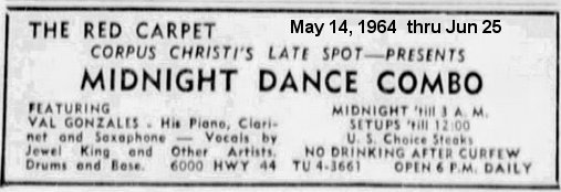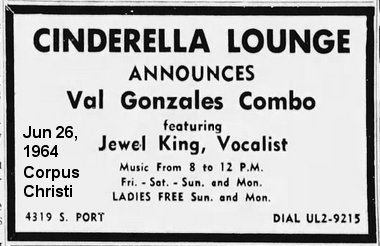 From May 14, 1964 through June 25, Jewel appeared at the Red Carpet, as the vocalist with the Val Gonzales combo. A day later, they were at the Cinderella Lounge. On August 7, they started a week at the Skipper's Club. These were all in Corpus Christi.