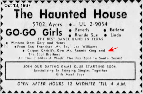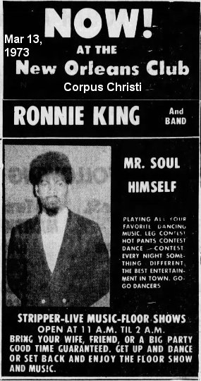 An ad for Ronnie King and Band had him at the New Orleans Club, in Corpus Christi, on March 13, 1973.