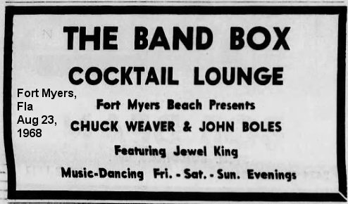On August 23, 1968, Jewel, along with Chuck Weaver and John Boles, appeared at the Band Box in Fort Myers.