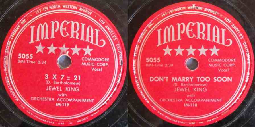 In December 1949, Imperial issued "3 x 7 = 21", backed with "Don't Marry Too Soon". They were reviewed in the January 14, 1950 Billboard: