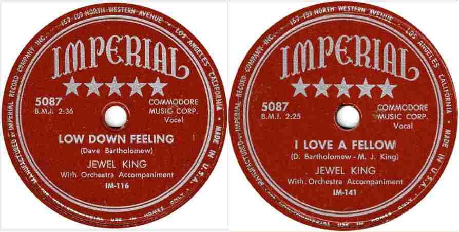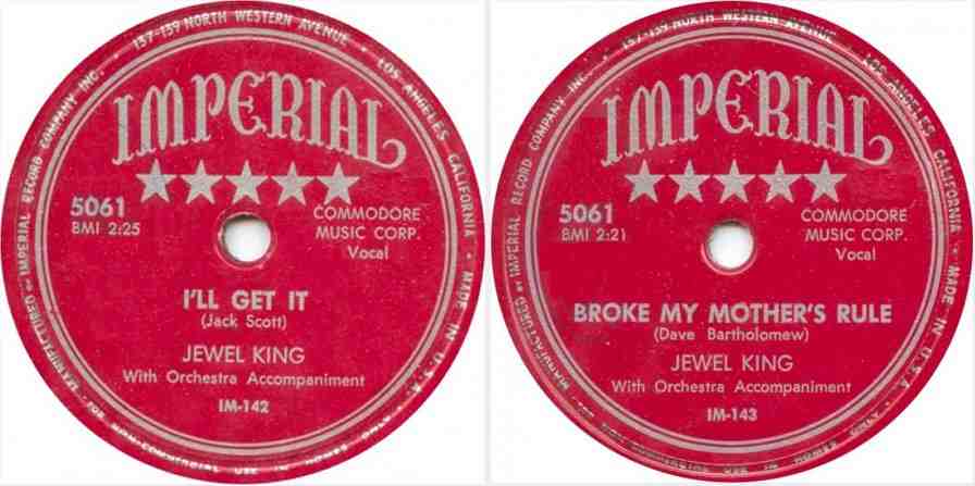 Sometime in February 1950, Imperial, realizing that Jewel King was going to be big, held a second session, also run by Dave Bartholomew: "Keep Your Big Mouth Shut" (written by Jack Scott), "I Love a Fellow" (written by D. Bartholomew - M.J. King), "I'll Get It" (by Jack Scott), and "Broke My Mother's Rule" (written by Dave Bartholomew).