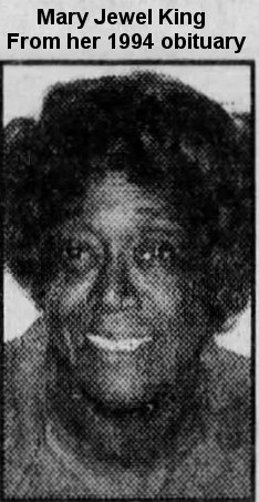 Mary Jewel King died, in Fort Myers, Florida, on September 26, 1994. At the time of her death, she was a retired educator from the Lee District School System (Ft. Myers is in Lee County). Her obituary, in the September 30 News-Press, had no mention at all of her singing career, but did say that she was a church organist, the only time she was mentioned as a musician. It gave the names of her deceased parents, her husband (Leslie A. Watkins), her son (Ronnie King), and her sister (Birdie Wicks, misspelled as "Hicks").
