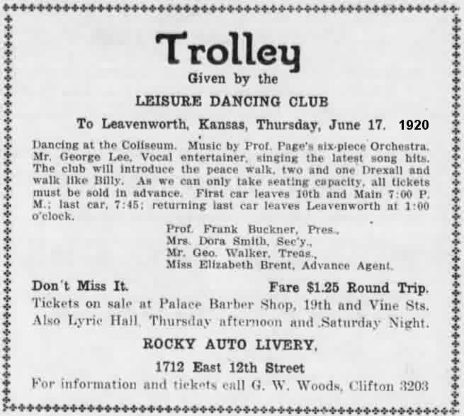 On June 17, 1920, there was a dance given by the Leisure Dancing Club of Leavenworth, Kansas, some 35 miles northwest of Kansas City. Trolley service was available (first car leaves 10th and Main at 7:00 PM). The band was "Prof. Page's six-piece Orchestra, Mr. George Lee, Vocal entertainer, singing the latest song hits". "Prof. Page" isn't further identified, but I suspect it's Walter Page (bassist, tuba, sax), future leader of Kansas City's Blue Devils. It's possible that George took time off from having his own band because Julia had become pregnant.