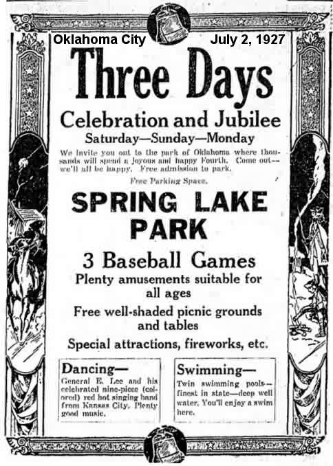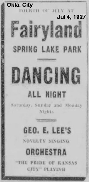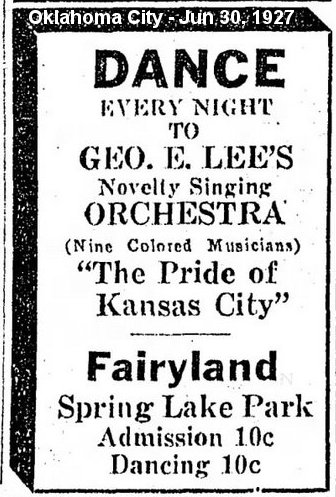 In early summer 1927, the Lee band (called "The Pride Of Kansas City") appeared at Spring Lake Park in Oklahoma City (about 350 miles from KC), on Saturday, Sunday, and Monday nights. The first ad that mentioned them was from June 30. While they may have still been around, they're not mentioned after July 29 (when they played for a dance for Oklahoma City's firemen), but they were certainly gone by October 1. At this time, Lee enlarged the band from seven to nine pieces: George E. Lee (reeds), Julia Lee (piano), Herman Walder (reeds), Clarence "Tweedy" Taylor (reeds), Robert Russell (trumpet), Sam Utterback (trumpet), Charles Rousseau (banjo), Clint Weaver (sousaphone and bass), and William D. Wood (drums). While ads generally referred to him as "Geo. E. Lee", a couple of them were misprinted as "General E. Lee".