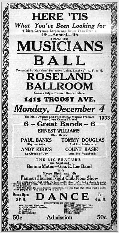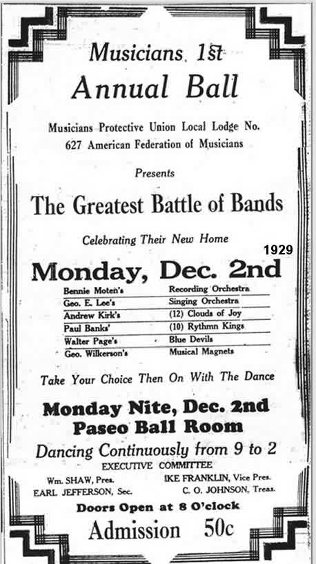 On December 2, 1929, there was a Musicians Ball at Kansas City's Paseo Ballroom. It would be the "Greatest Battle Of The Bands", featuring Bennie Moten's Recording Orchestra, Geo. E. Lee's Singing Orchestra, Andrew Kirk's (12) Clouds Of Joy, Paul Banks' (8) Rhythm Kings, Walter Page's Blue Devils, and Geo. Wilkerson's Musical Magnets.