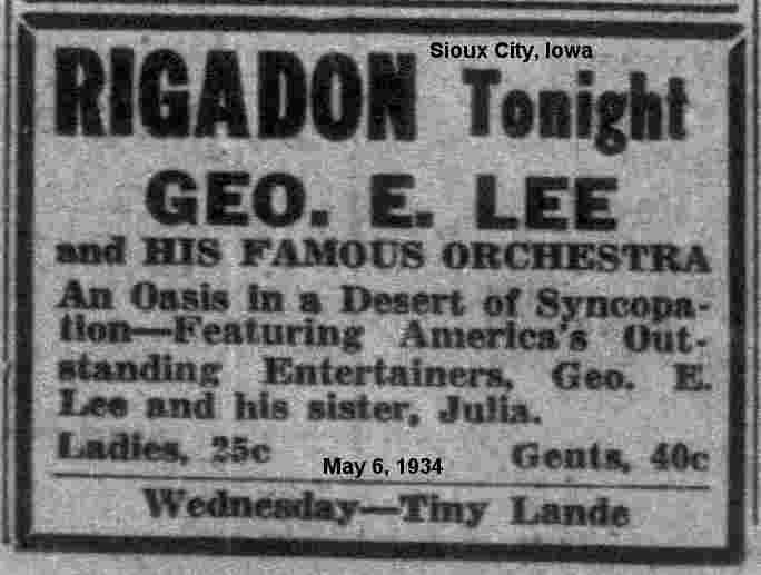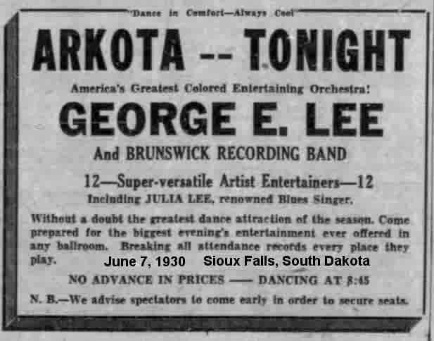 But they slogged on. A June 7, 1930 ad for the Arkota Ballroom in Sioux Falls, South Dakota was for: "George E. Lee And Brunswick Recording Band. 12 Super-versatile Artist Entertainers, Including Julia Lee, Renowned Blues Singer". A blurb in the June 7 Sioux Falls Argus-Leader told fans that the band had "won a battle of music from Zez Confrey and his recording orchestra at the Rigadon Ballroom in Sioux City [Iowa] early this week by a walkaway."