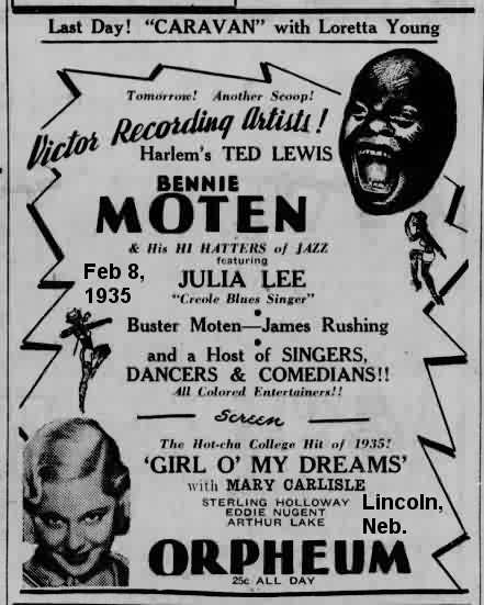 Soon, George started adding musicians and used Jesse Stone as an arranger. They were now the George E. Lee Singing Novelty Orchestra. His big competition was Bennie Moten. [Bennie was the younger brother of pianist Ira "Bus" Moten. There seems to be some confusion as to how they were related, but in the 1900 census they were both enumerated as sons of Reuben and Lizzie Moten.]