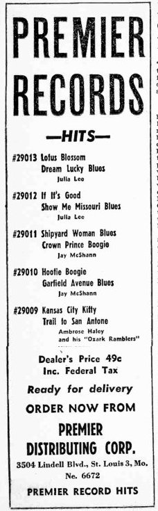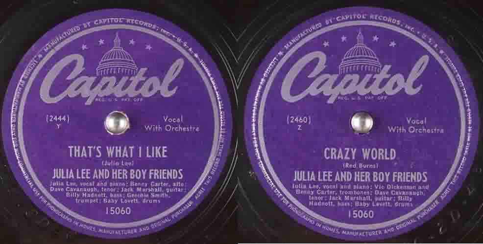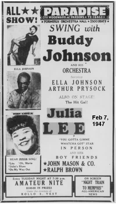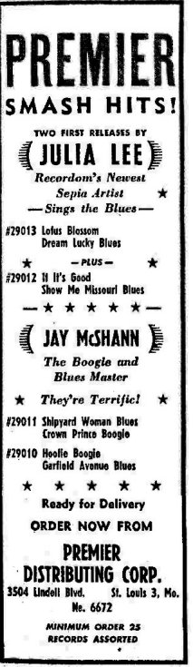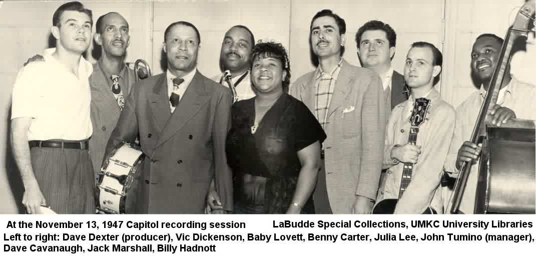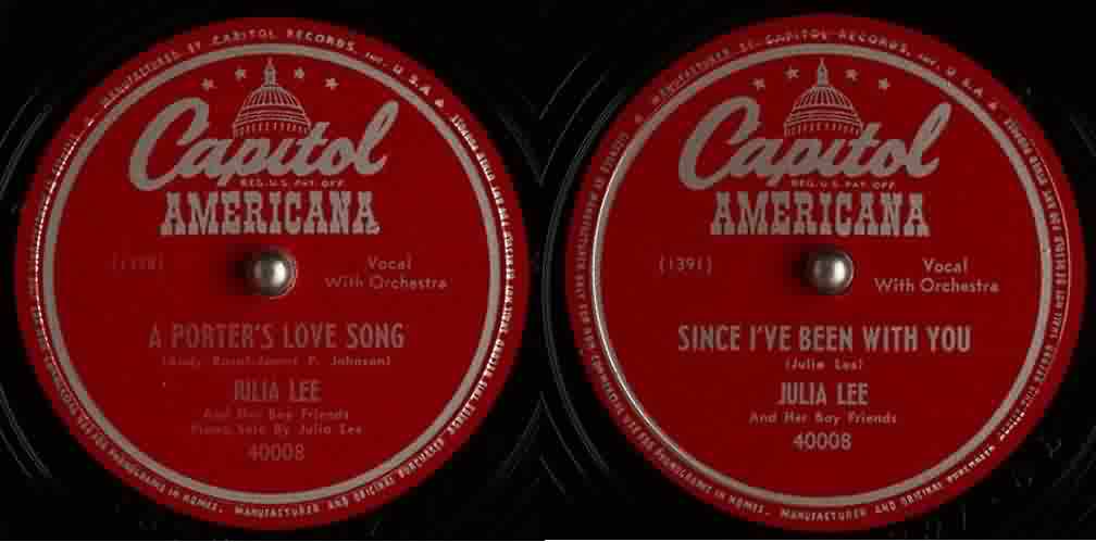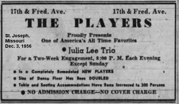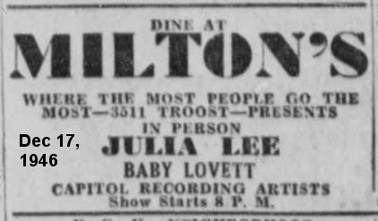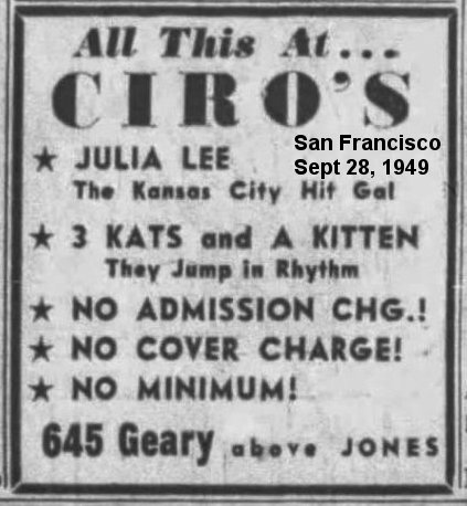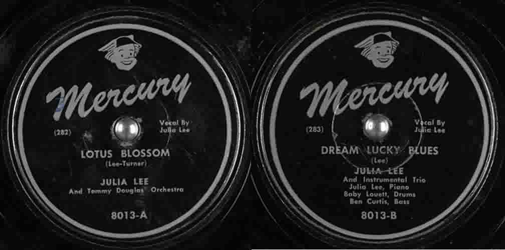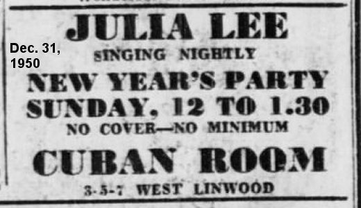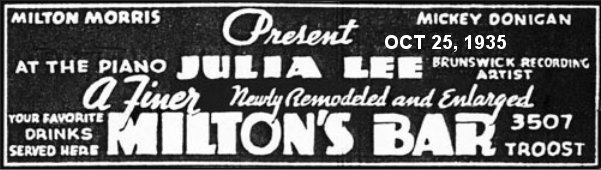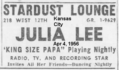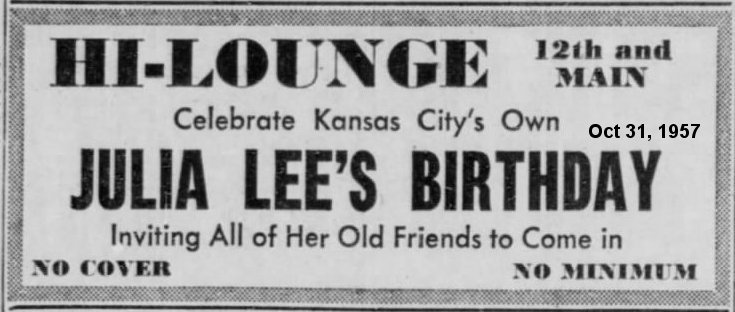 Because I'm neither a Kansan nor a sociologist, I'll try to sum it up in one paragraph. Storyville was the wild district in New Orleans, shut down in 1917. Jazz musicians started flowing north, most ending up in Chicago. This became somewhat of a "closed town" to other jazz musicians and those in Kansas City mostly stayed there and developed their own style. Along came Tom Pendergast, the political boss who ran Kansas City, starting around 1925. He had no problem being openly friendly with gangsters, gamblers, and bootleggers, promoting KC as a wide-open town. (Remember, this was during the time of Prohibition, which had begun on January 1, 1920.) This is the atmosphere in which Julia Lee began her career. (Since there are many books and papers on the subject, thus ends my lengthy discourse on the history of Kansas City.)