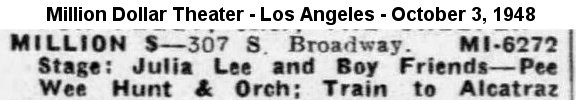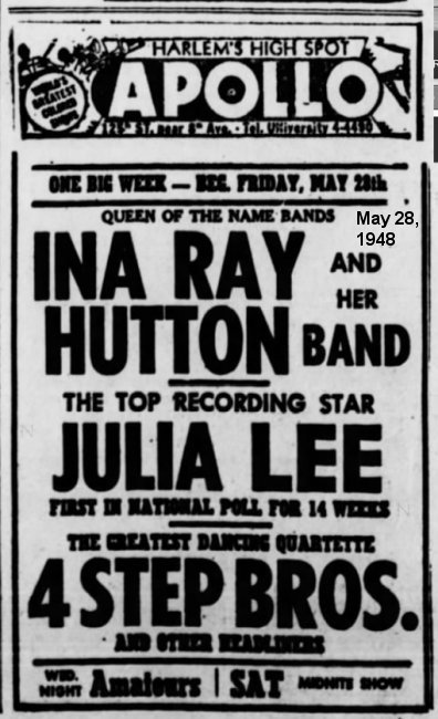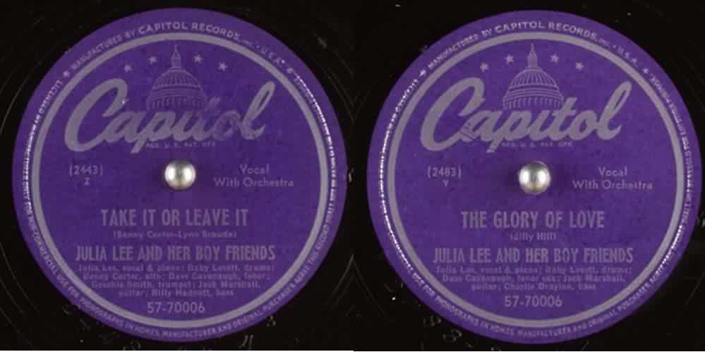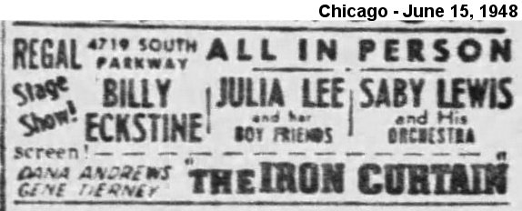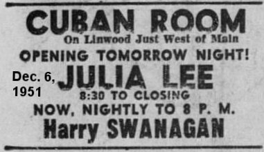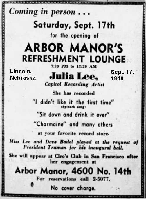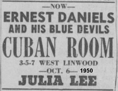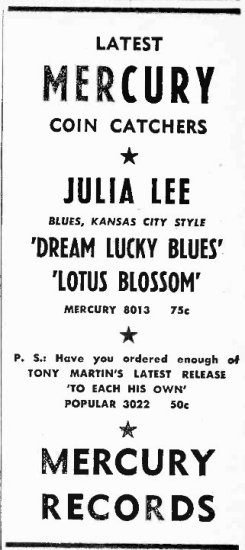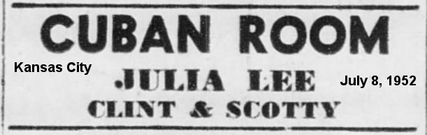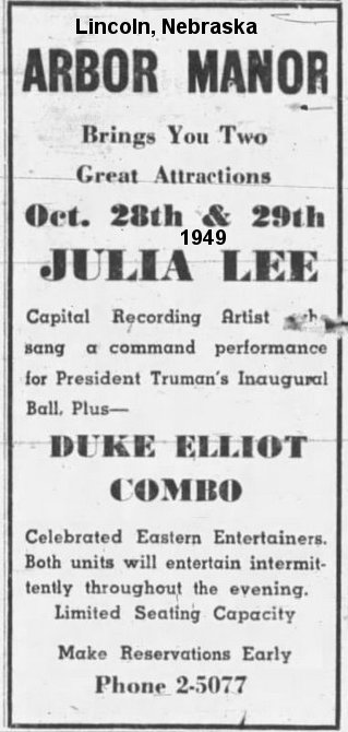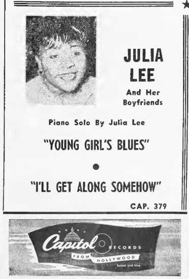 Original arrangements add color to the musical presentations. The big feature in the way of entertainment is the singing of Julia Lee, a blues singer with the band. Her work was such an outstanding feature in several of the recordings of the band that she is now being featured individually on records.