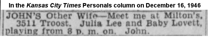 At the time of the 1930 census, Julia and Johnnie Thomas (and her son Frank) were living in Kansas City with her parents. She was an "orchestra musician"; he was a porter in a club.