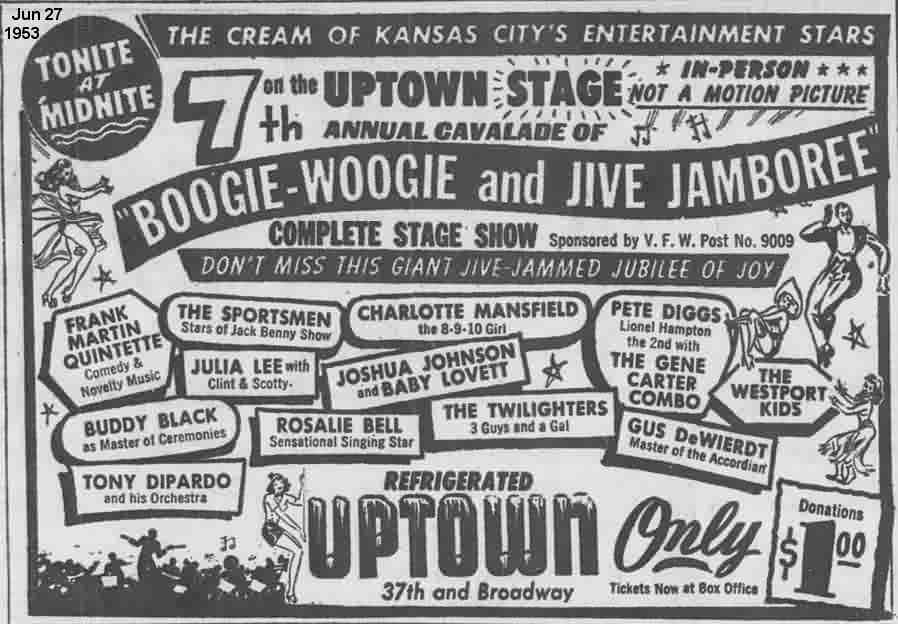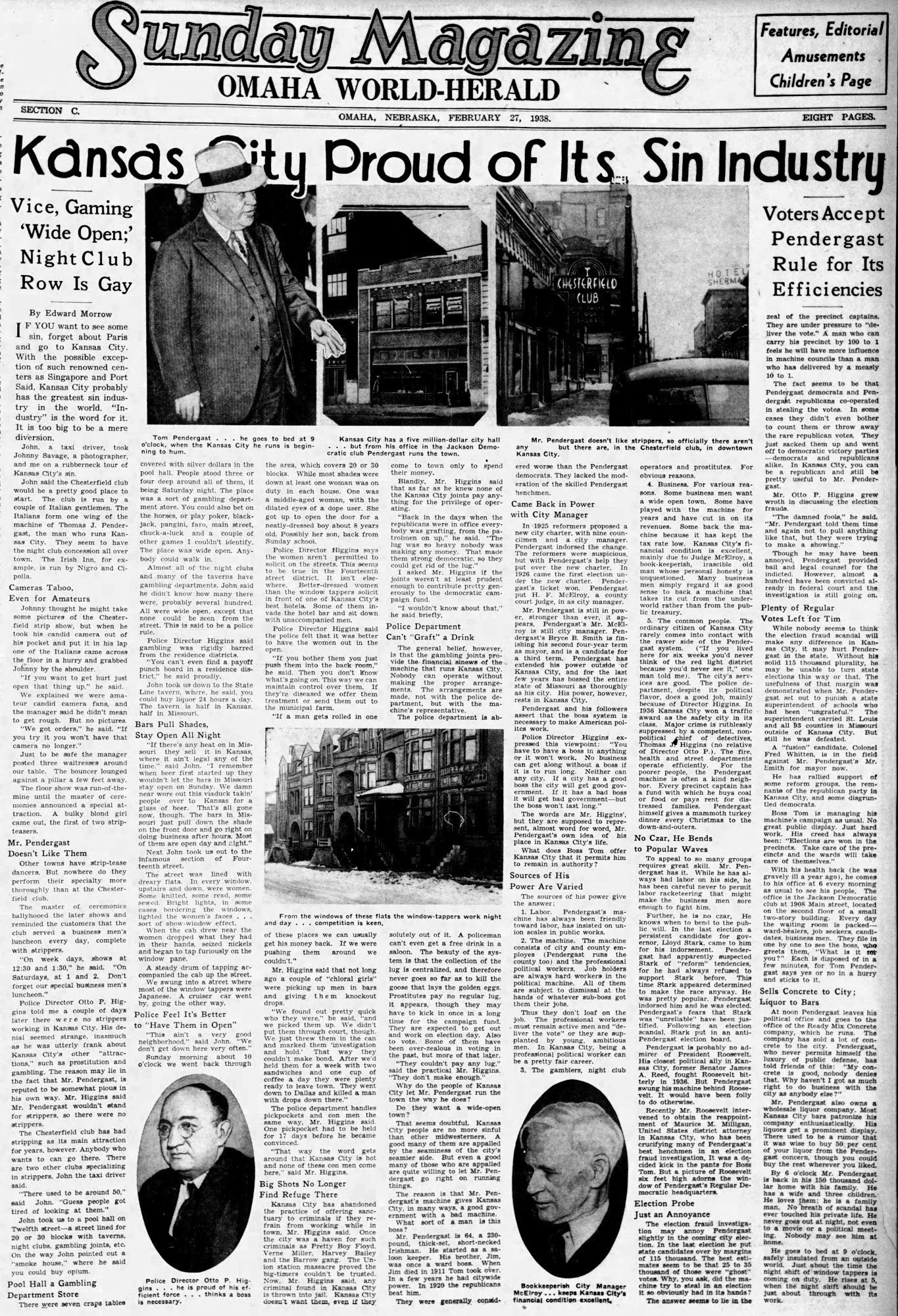 This is the time where I launch into a lengthy (and probably wholly-inaccurate) discourse on wide-open Kansas City. Columnist Edward Murrow supposedly wrote in the Omaha World Herald: "If you want to see some sin, forget Paris and go to Kansas City." (Everyone quotes this line, but no one seems to know when it was written. Note that he's not the famous newsman Edward R. Murrow, but a columnist with a similar name. However, since this quote is also attributed to Westbrook Pegler [ARSC Journal, Spring 1990], unless someone can show me the original in a newspaper, I'll have to assume that it was simply made up many years later.) And I found it: it was the first sentence in a huge article, titled Kansas City Proud Of Its Sin Industry, written by Edward Murrow on the first page of the February 27, 1938 Omaha World-Herald's Sunday Magazine. Budding sociologists can read it here: Newspaper Article