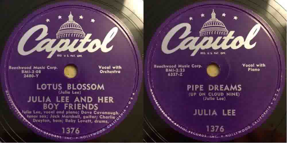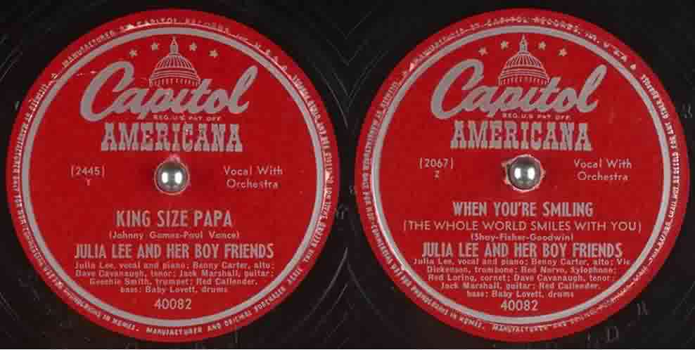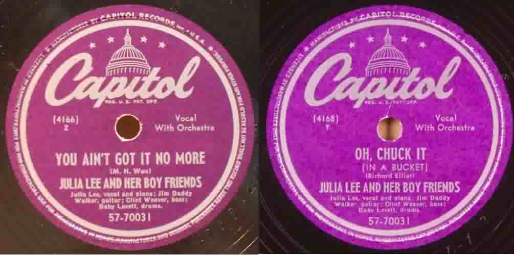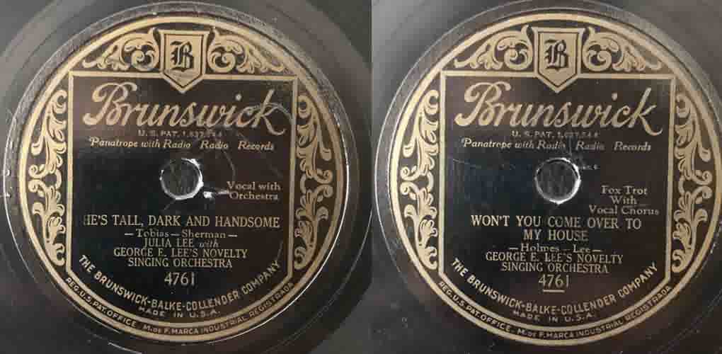 Brunswick issued Julia's "He's Tall, Dark And Handsome", coupled with "Won't You Come Over To My House" in April 1930. Label credit went to "George E. Lee's Novelty Singing Orchestra". Julia is identified as the vocalist on the top side ("He's Tall"), but not, for some reason, on the flip.