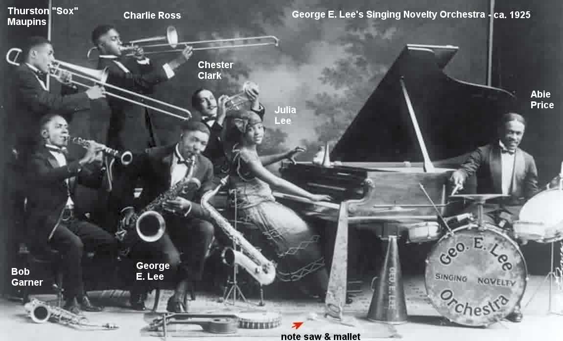Spring 1927 - The known members of the band at this time were: George E. Lee (sax), Julia Lee (piano), Clarence "Tweedy" Taylor (sax, clarinet), Sam Utterback (trumpet), Thurston "Sox" Maupins (trombone), Clint Weaver (bass), and Abie Price (drums).