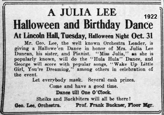 An ad in the October 28 Sun was for a Halloween And Birthday Dance that George Lee was throwing, for Julia, at Lincoln Hall (remember, Julia was born on October 31). "Sheiks and Backbiters will all be there!", said the ad.