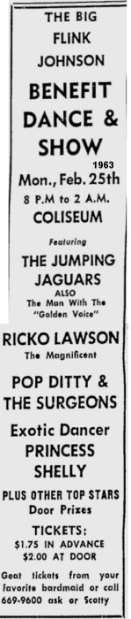 Along the way, there were some other personnel changes. A small blurb for a May 1959 show lists the members as Hooks Holcomb, Ray Holcomb, Rudolph Chew, Andy Piggett (presumably a bass), and Bobby Hall. I'm not sure how long Bobby Hall lasted this time, but James Arthur would return, since he's in a 1963 photo of the group. (When Bobby Hall died in December 1976, the small obituary noted that he'd been with the Kings, as well as "Pop Ditty and the Surgeons". There's an ad for that group's appearance in February 1963, but they're presumably not the Surgeons who recorded for Cee-Jam a couple of months later; they seem to have been a California group.)
