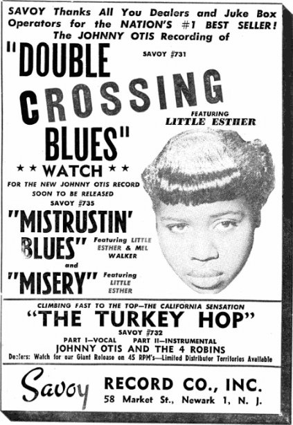 In the meanwhile, Billboard had been holding a survey of Top Selling Rhythm & Blues artists. When the final votes were in (reported in the July 15 issue), the Johnny Otis Orchestra was in the #1 position with 3061 points (1779 of them due to "Double Crossing Blues") and Little Esther was in the #2 slot with 3028 points (the same 1779 from "Double Crossing Blues"). Far behind, at #3 (2475 points) was Ivory Joe Hunter.