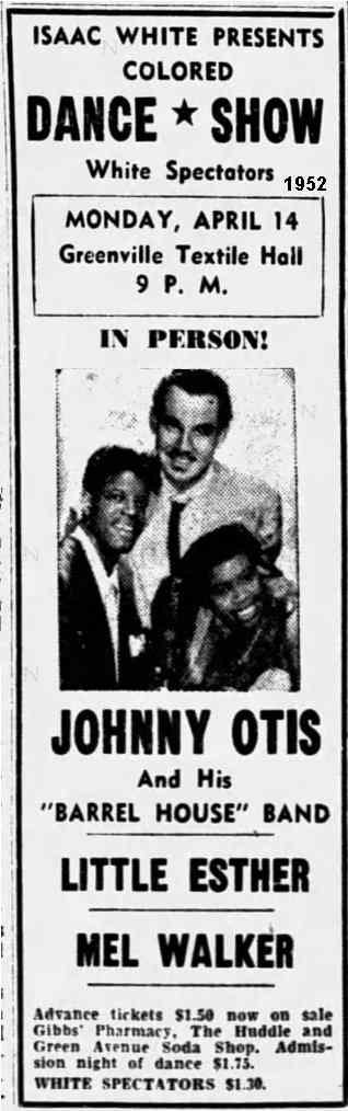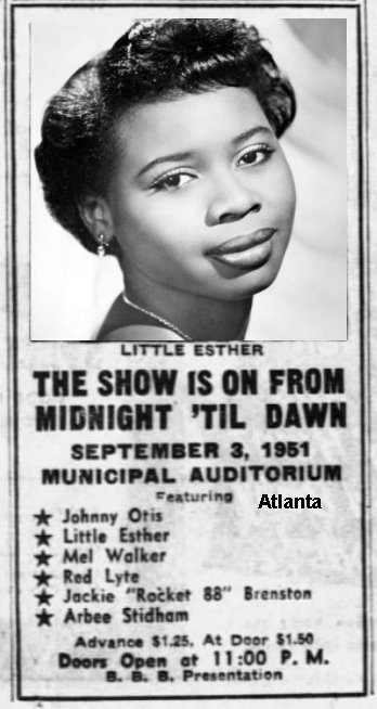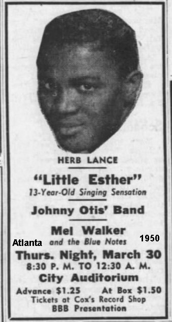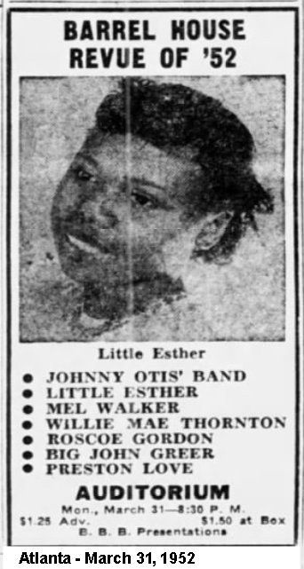 The "Savoy Barrelhouse Caravan" tour kicked off in March 1950. On March 30, the Otis unit appeared at the City Auditorium in Atlanta along with Herb Lance. Esther was billed the "13-Year.-Old Singing Sensation" (although she was now an aging 14). Also advertised were Mel Walker and the Blue Notes (who would be used to back Esther on "Double Crossing Blues" in place of the Robins). The March 25 Pittsburgh Courier said: "As for Little Esther, she really has a voice. It rivals Dinah Washington's for bell-like clearness and distinctive qualities . . . and with a feelin'."