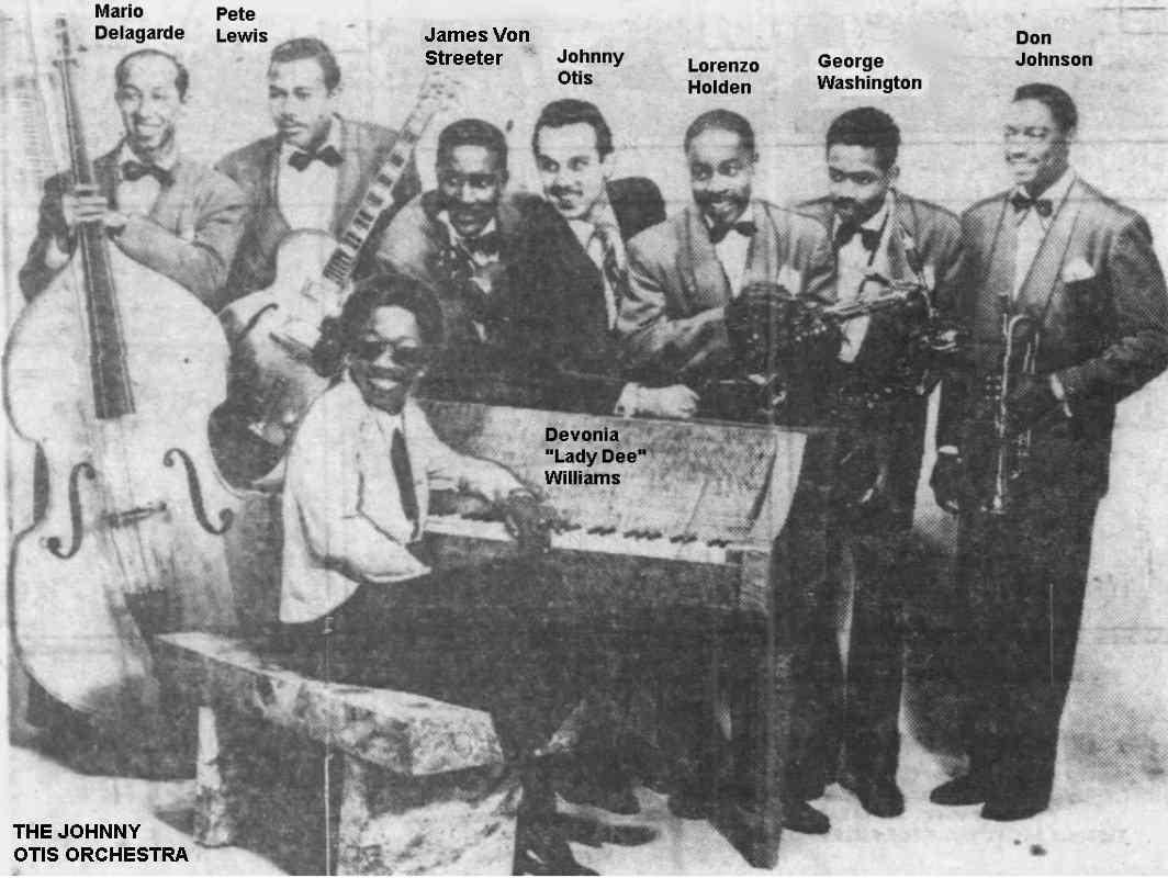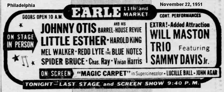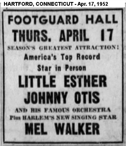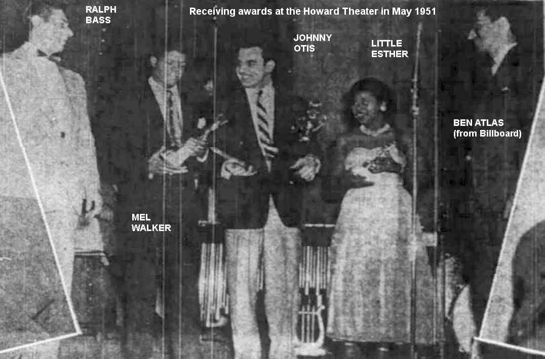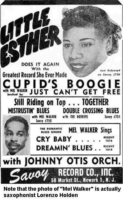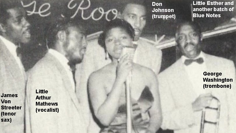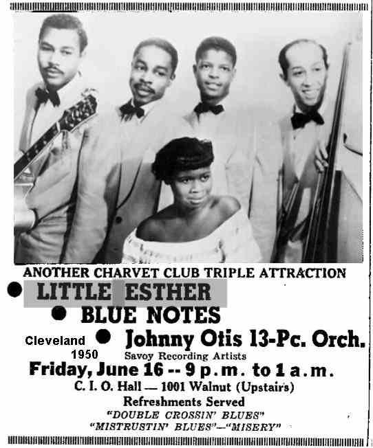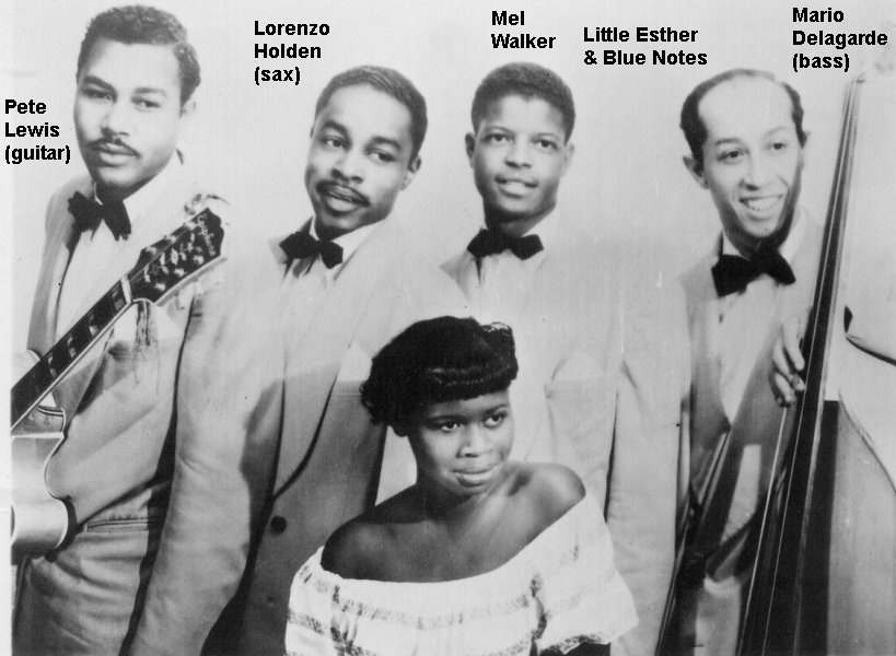 It's probable, therefore, that the group shown in a 1950 promotional photo with Little Esther and billed as the Blue Notes (guitarist Pete Lewis, tenor saxman Lorenzo Holden, bassist Mario Delagarde, and Mel Walker) performed the Robins' material during the Barrelhouse Caravan tour. (For a couple of years, Otis' shows would advertise the Blue Notes [sometimes the 4 Blue Notes]; they had varying membership.)