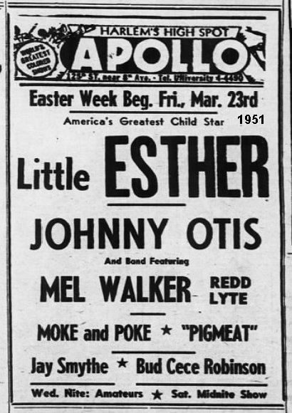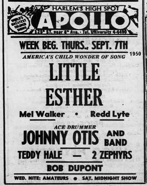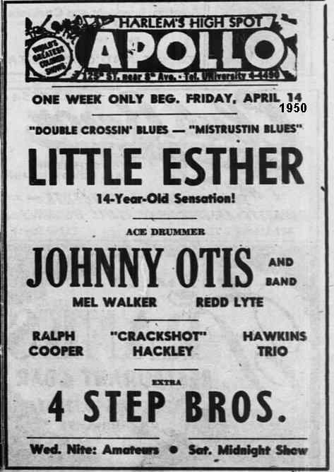 Soon after, in April, Modern released the remaining songs from that October 1949 session: "Mean Ole Gal" and "Good Old Blues". That same month, Esther made her first appearance at the Apollo Theater (the week of April 14). As would happen several times in the future, Little Esther ("14-Year-Old Sensation!") was the headliner, with Otis' name second on the bill. Mel Walker and Redd Lyte were also named (but in much smaller letters).