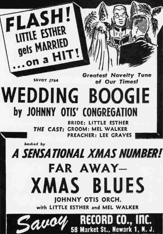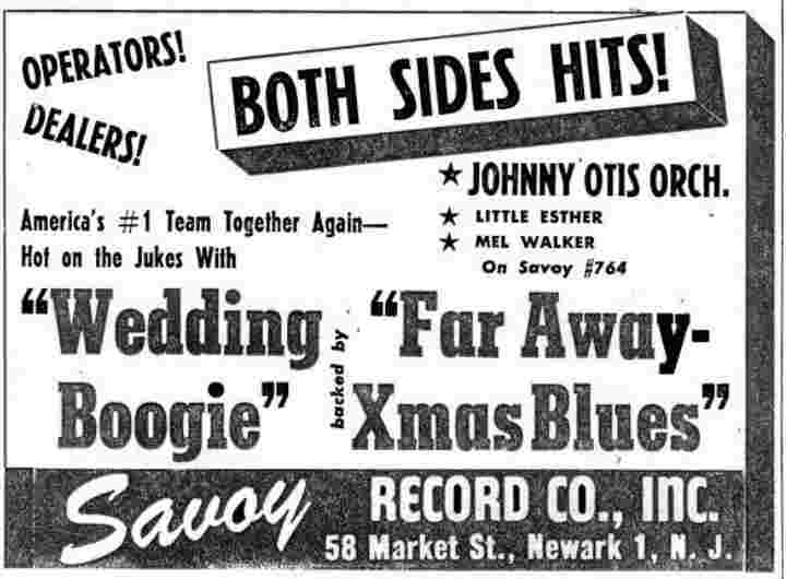 In October, Savoy issued "Wedding Boogie" and "Far Away Blues (Xmas Blues)". Both have Little Esther and Mel Walker, with the addition of Lee Graves (a trumpeter in Otis' orchestra) as the preacher on "Wedding Boogie". I get the feeling that "Far Away Blues (Xmas Blues)" was another label misprint, since Savoy ads called it "Faraway Xmas Blues".