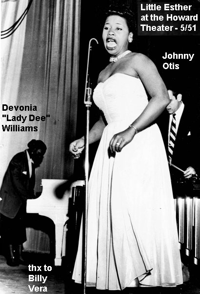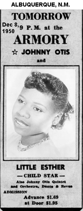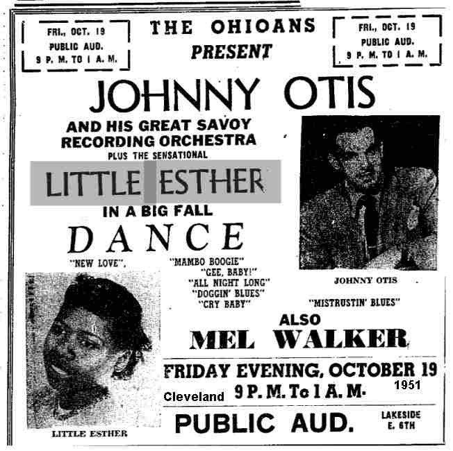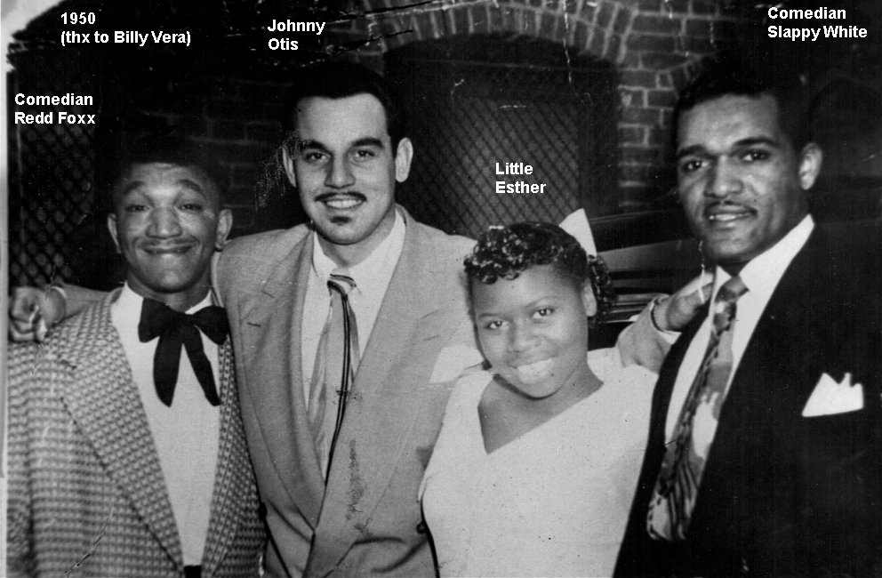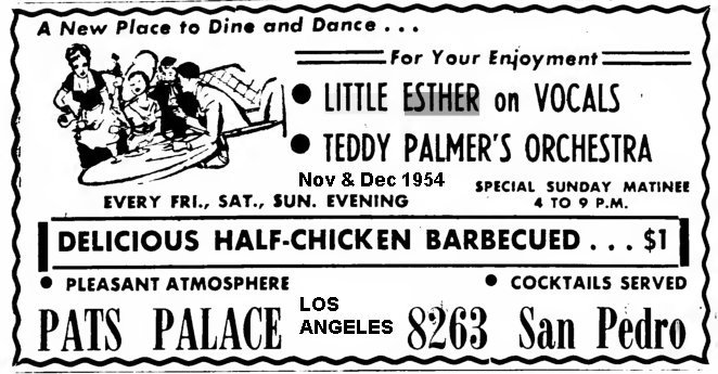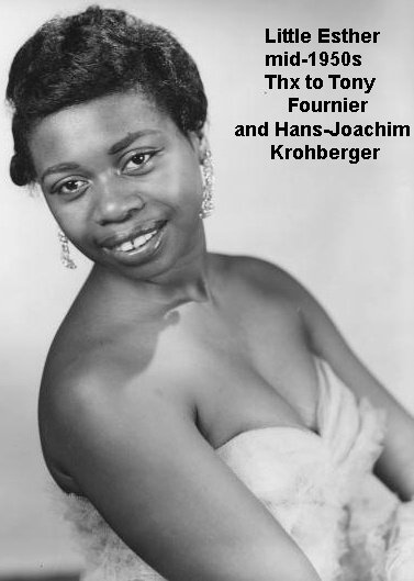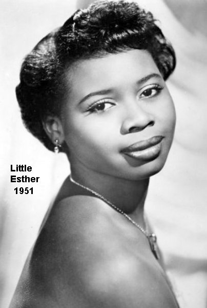 Esther initially made a name for herself by teaming up with bandleader Johnny Otis. But how did this come about? Otis himself completely confuses the issue. In his 1968 book, "Listen To The Lambs", he said he heard Esther singing in a talent show at the Largo Theater on 103rd Street in the Watts section of Los Angeles. Esther maintained that she did perform in a talent show, singing Dinah Washington's "Baby Get Lost". However, when Esther died, Otis wrote this (which appeared in the August 20, 1984 Jet): "I've lost a daughter.... People think I first found her as a singer, that's not true. I had a chicken ranch and I had little kids in the neighborhood run and catch chickens for me. And Esther was one of the little kids . . . And then one day, we were resting and having some lemonade and she started singing those Dinah Washington songs. And I said, 'Girl, I didn't know you could sing like that.'"
