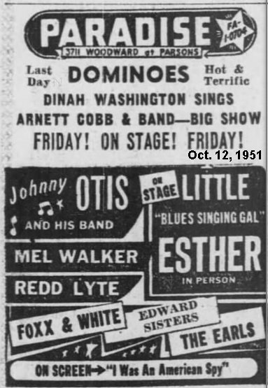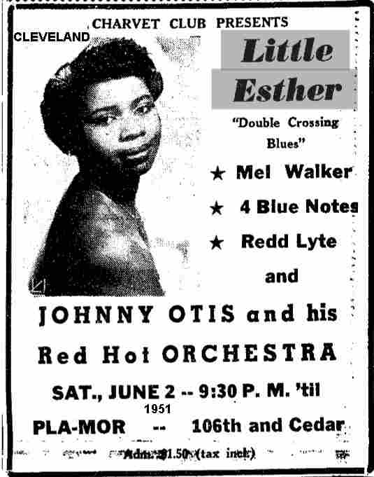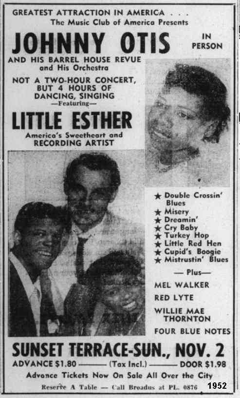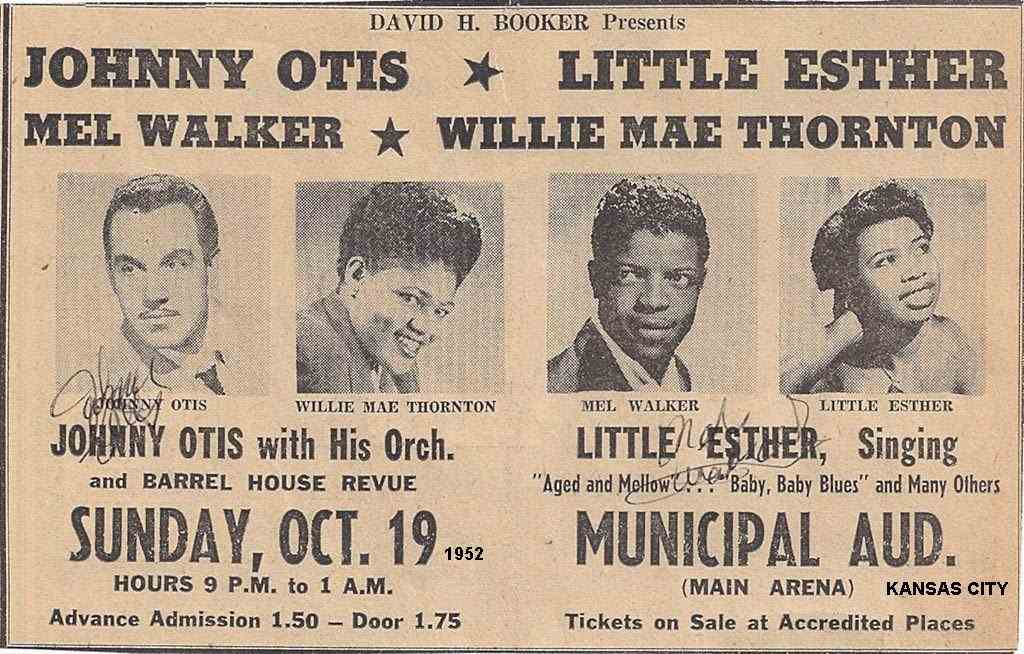 On January 20, 1951, the Otis orchestra, along with Little Esther, Mel Walker, Redd Lyte, and the "4 Blue Notes" appeared at the Kaliko Kat in Wichita, Kansas as the "Double Crossin' Blues Revue".