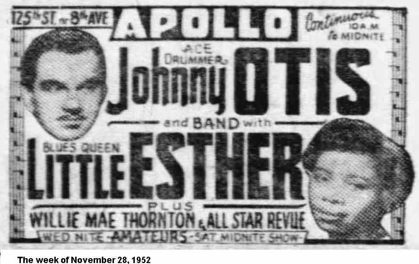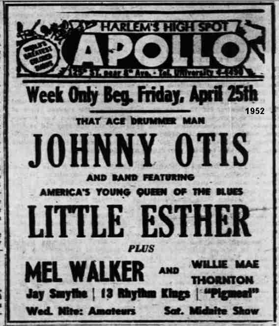 Recently at the famed Apollo theatre [the week of January 11, 1963] tears rolled down her cheeks when she walked onstage and those who remembered her when she was the sensation with the Johnny Otis band back in the early 40s [sic] greeted her with an ovation. And she didn't disappoint them as she literally sang her heart out. [Literally? Boy, that must have been messy.]